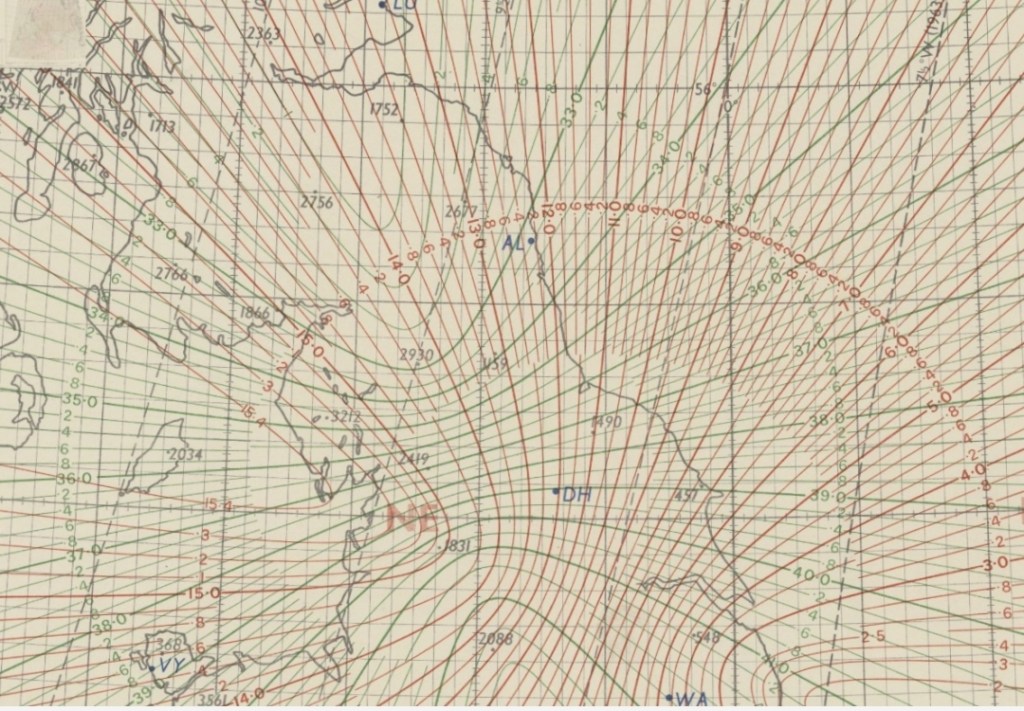 Lines of constant delay are plotted in ‘GEE units’ (each of 66.66 us), with the Time Difference of Arrival (TDoA) between A and B station shown in in red lines and the TDoA between A and C stations shown in green.