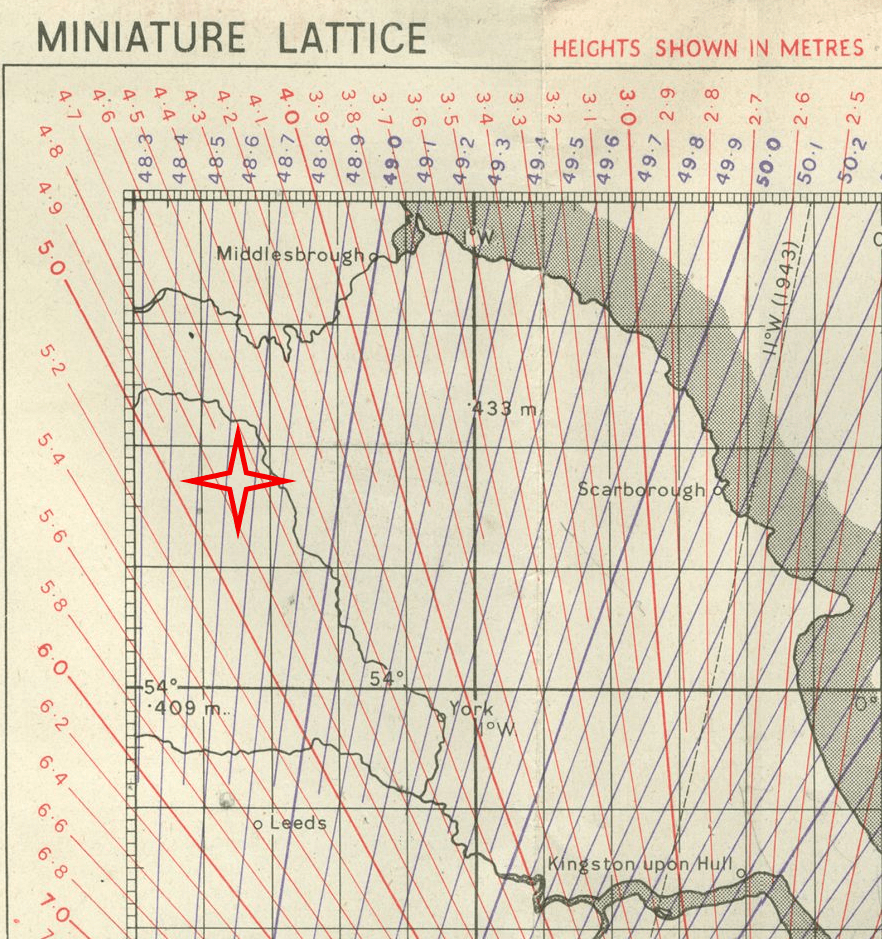The following image is a close-up of the GEE plot near RAF Leeming, which shows that the D-plot of the TDoA curves would have almost aligned with runway 34/16 at 48.65 GEE units.