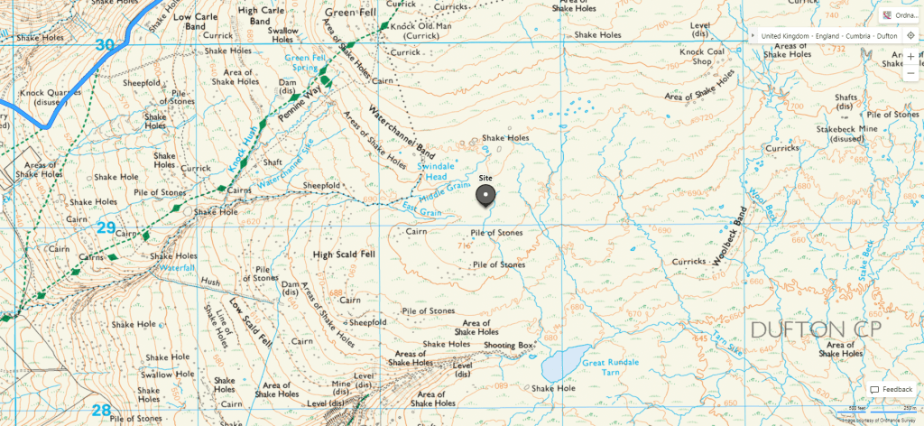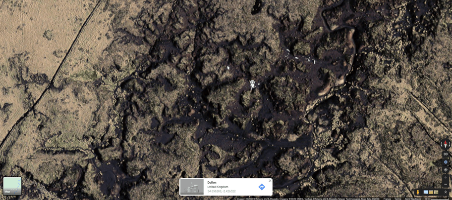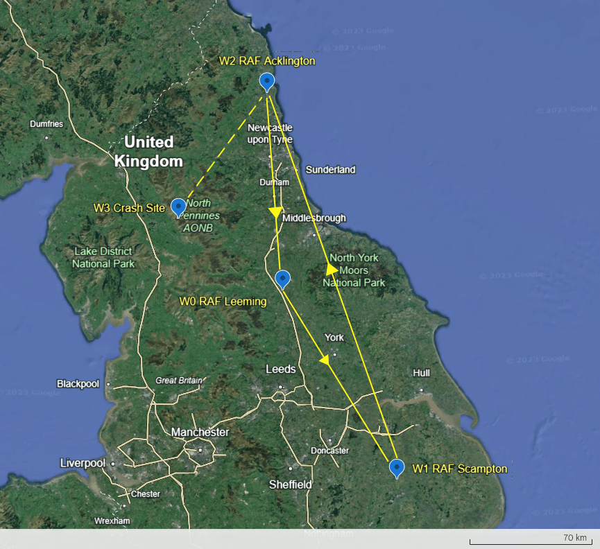 The route from Leeming to Scampton, then up to Acklington, is shown in the map below. The crash site is also shown. Misrepresented here as a dotted line from Acklington. The aircraft was, in fact, controlled to within 5 miles of the airfield at 2500 ft.