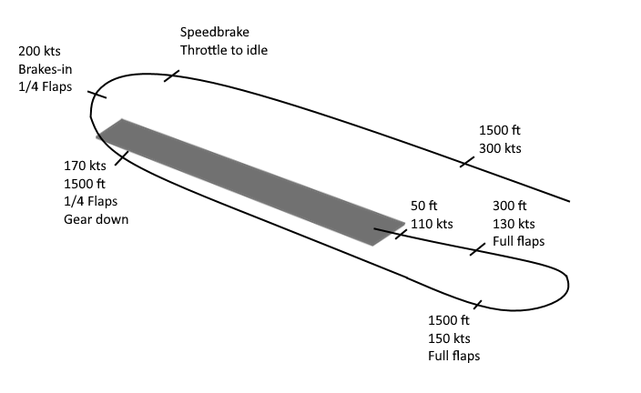The downwind leg is made at 150 kts, with 1/4 flap and the gear deployed.