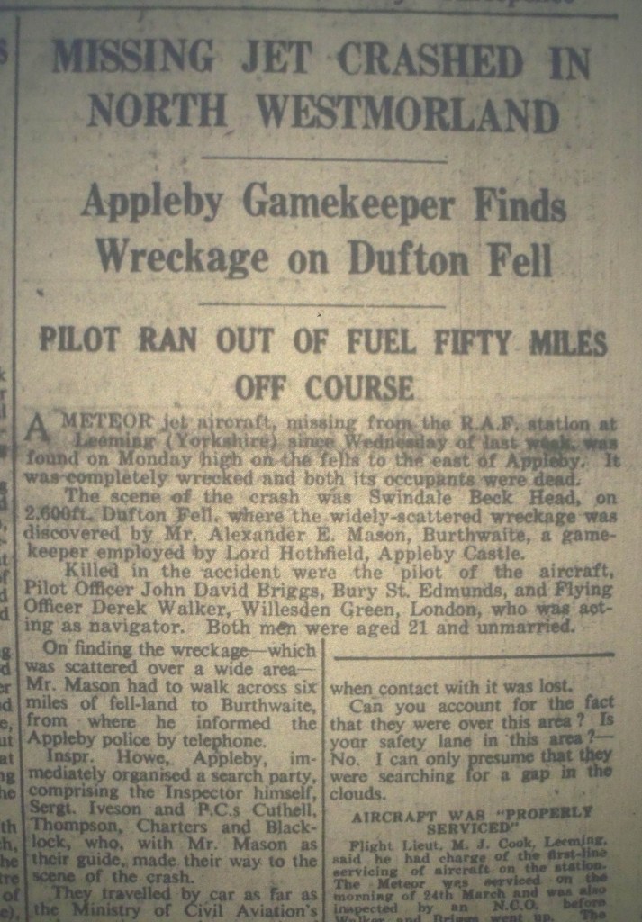 A meteor jet aircraft, missing from the RAF station at Leeming (Yorkshire) since Wednesday of last week as found on Monday high on the fells to the east of Appleby. It was completely wrecked and both its occupants were dead.