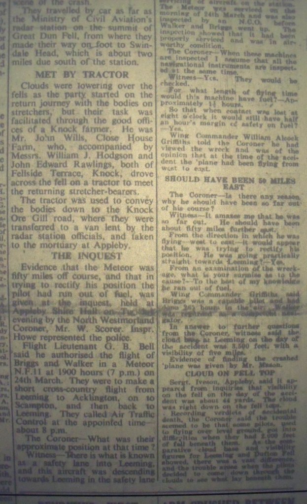 Recording verdicts of accidental death, the Coroner said the trouble seemed to be that some pilots, used to fling over level ground, got into difficulties when they had over 2600ft of fell beneath them. As the comparative cloud base figures for Leeming and Dufton Fell showed, there was a vast difference, and the trouble arose when the pilots decided to come down through the clouds to see what lay beneath them.
