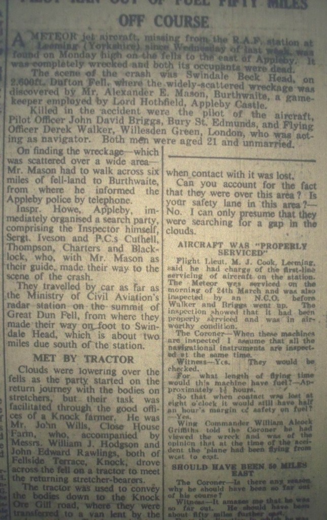 Evidence that the Meteor was fifty miles off course, and that in trying to rectify his position the pilot had run out of fuel, was given at the inquest, held at Appleby Shire Hall on Tuesday evening by the North Westmoorland Coroner, Mr W Scorer Inspr Howe represented the police.