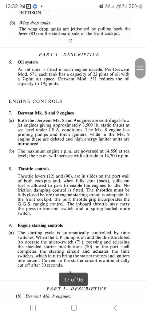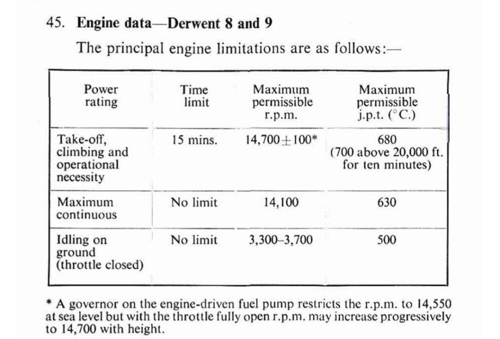 “I aligned the Meteor 8 for takeoff, applied the brakes, and checked that they held the aircraft stationary while the throttles were opened to give 11,000 rpm on each engine. Releasing the brakes, the throttles were opened fully and a quick check made of the engines’ speed – 14,550 rpm, jet pipe temperatures below 680 degrees Celsius, and fire warning lights out. The Meteor 8 accelerated rapidly and the nose wheel was eased off the ground at 70 knots, making sure not to hit the tail on the ground by raising the nose wheel too high. At 130 knots the Meteor flies itself off the ground. The undercarriage was retracted – before 175 knots, the flaps raised, and the climb began at 300 knots indicated airspeed with full power still set.”